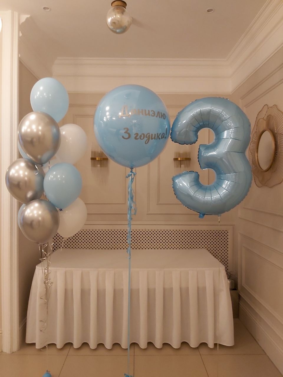 Состав: шар зеркальный с именной надписью, фольгированная цифра, шары хром,  латексные шары, груз для удержания композиции.