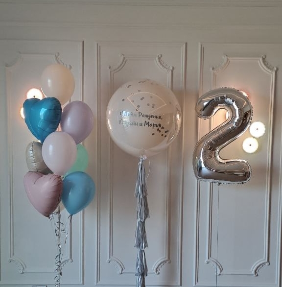 Состав: шар зеркальный с надписью на ленте тассел, фольгированные сердца, фольгированная цифра, латексные шары, груз для удержания композиции.